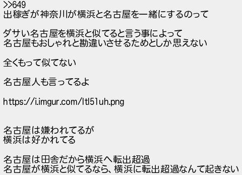 653: (神奈川県) [] 2023/06/03(土) 22:56:15.79 ID:NJtj6yBS >>649 出稼ぎが神奈川が横浜と名古屋を一緒にするのって ダサい名古屋を横浜と似てると言う事によって 名古屋もおしゃれと勘違いさせるためとしか思えない 全くもって似てない 名古屋人も言ってるよ https://i.imgur.com/Itl51uh.png 名古屋は嫌われてるが 横浜は好かれてる 名古屋は田舎だから横浜へ転出超過 名古屋が横浜と似てるなら、横浜に転出超過なんて起きない http://egg.5ch.net/test/read.cgi/develop/1684925209/653