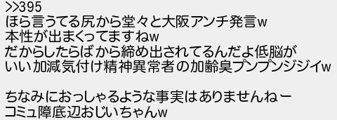 ほら言うてる尻から堂と大阪アンチ発言 本性が出まくってますね だからしたらばから締め出されてるんだよ低脳が いい加減気付け精神異常者の加齢臭プンプンジジイ ちなみにおっしゃるような事実はありませんねー コミュ障底辺おじいちゃん