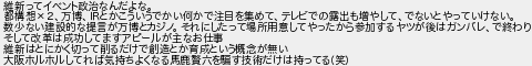 維新ってイベント政治なんだよな 都構想2万博とかこういうでかい何かで注目を集めてテレビでの露出も増やしてでないとやっていけない 数少ない建設的な提言が万博とカジノそれにしたって場所用意してやったから参加するヤツが後はガンバレで終わり そして改革は成功してますアピールが主なお仕事 維新はとにかく切って削るだけで創造とか育成という概念が無い 大阪ホルホルしてれば気持ちよくなる馬鹿六をす技術だけは持ってる笑