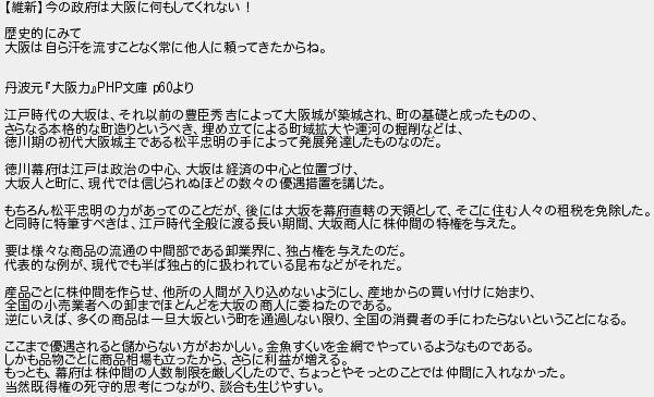 維新今の政府は大阪に何もしてくれない! 歴史的にみて 大阪は自ら汗を流すことなく常に他人に頼ってきたからね 丹波元大阪力文庫 より 江戸時代の大坂はそれ以前の豊臣秀吉によって大阪城が築城され町の基礎と成ったものの さらなる本格的な町造りというべき埋め立てによる町域拡大や運河の掘削などは 徳川期の初代大阪城主である松平忠明の手によって発展発達したものなのだ 徳川幕府は江戸は政治の中心大坂は経済の中心と位置づけ 大坂人と町に現代では信じられぬほどの数の優遇措置を講じた もちろん松平忠明の力があってのことだが後には大坂を幕府直轄の天領としてそこに住む人の租税を免除した と同時に特筆すべきは江戸時代全般に渡る長い期間大坂商人に株仲間の特権を与えた 要は様な商品の流通の中間部である卸業界に独占権を与えたのだ 代表的な例が現代でも半ば独占的に扱われている昆布などがそれだ 産品ごとに株仲間を作らせ他所の人間が入り込めないようにし産地からの買い付けに始まり 全国の小売業者への卸までほとんどを大坂の商人に委ねたのである 逆にいえば多くの商品は一旦大坂という町を通過しない限り全国の消費者の手にわたらないということになる ここまで優遇されると儲からない方がおかしい金魚すくいを金網でやっているようなものである しかも品物ごとに商品相場も立ったからさらに利益が増える もっとも幕府は株仲間の人数制限を厳しくしたのでちょっとやそっとのことでは仲間に入れなかった 当然既得権の死守的思考につながり談合も生じやすい