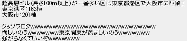 590: (庭) [sage] 2023/11/23(木) 12:52:18.17 ID:xmYJ61Eq 超高層ビル(高さ100m以上)が一番多い区は東京都港区で大阪市に匹敵! 東京港区:163棟 大阪市:201棟 クッソワロタwwwwwwwwwwwwwwwwwwwwwwwwwwww 悔しいのうwwwwwww東京関東が羨ましいのうwwwwwww 強がらなくていいぞwwwwwww http://egg.5ch.net/test/read.cgi/develop/1700554255/590