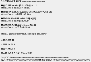 721: (庭) [sage] 2023/11/23(木) 16:04:50.71 ID:sfCXiqFi これが動かぬ現実ですwwwwwwwwwwwwww ●夜の大阪めっちゃ絡まれるし怖い!! https://youtu.be/x9ARV-uNqIE ●【危険】大阪のスラム街に行ってみたら色々ヤバかった https://youtu.be/L07HomGL4Aw ●西成あいりん地区 ちあんの悪さ実態 https://youtu.be/UqaNcEMGlyI ●日本のカオス西成あいりん三角公園 https://youtu.be/TvTetA-2csY https://s.sumaity.com/town/ranking/osaka/crime/ 大阪の犯罪率 大阪平均1.64 % 全国平均0.90 % 日本最大のスラム街、それが大阪 クッソワロタwwwwwwwwwwwwwwwwwwwwwwwwwwwwwwwwwww 悔しいのうwwwwwwwwwwwwwww東京関東が羨ましいのうwwwwwwwwwwwwwwwwwwww http://egg.5ch.net/test/read.cgi/develop/1700554255/721