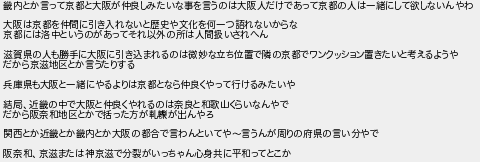 畿内とか言って京都と大阪が仲良しみたいな事を言うのは大阪人だけであって京都の人は一緒にして欲しないんやわ 大阪は京都を仲間に引き入れないと歴史や文化を何一つ語れないからな 京都には洛中というのがあってそれ以外の所は人間扱いされへん 滋賀県の人も勝手に大阪に引き込まれるのは微妙な立ち位置で隣の京都でワンクッション置きたいと考えるようや だから京滋地区とか言うたりする 兵庫県も大阪と一緒にやるよりは京都となら仲良くやって行けるみたいや 結局近畿の中で大阪と仲良くやれるのは奈良と和歌山くらいなんやで だから阪奈和地区とかで括った方がが出んやろ 関西とか近畿とか畿内とか大阪の都合で言わんといてや言うんが周りの府県の言い分やで 阪奈和京滋または神京滋で分裂がいっちゃん心身共に平和ってとこか