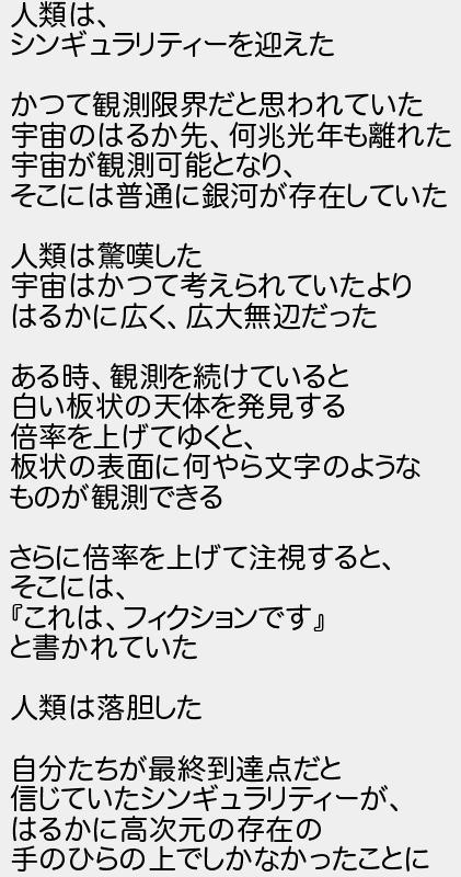 人類は シンギュラリティーを迎えた かつて観測限界だと思われていた 宇宙のはるか先何兆光年も離れた 宇宙が観測可能となり そこには普通に銀河が存在していた 人類は驚嘆した 宇宙はかつて考えられていたより はるかに広く広大無辺だった ある時観測を続けていると 白い板状の天体を発見する 倍率を上げてゆくと 板状の表面に何やら文字のような ものが観測できる さらに倍率を上げて注視すると そこには これはフィクションです と書かれていた 人類は落胆した 自分たちが最終到達点だと 信じていたシンギュラリティーが はるかに高次元の存在の 手のひらの上でしかなかったことに