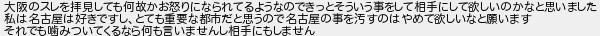 大阪のスレを拝見しても何故かお怒りになられてるようなのできっとそういう事をして相手にして欲しいのかなと思いました 私は名古屋は好きですしとても重要な都市だと思うので名古屋の事を汚すのはやめて欲しいなと願います それでも噛みついてくるなら何も言いませんし相手にもしません