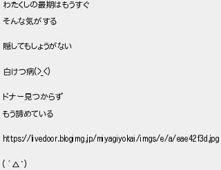 33: 警備員[Lv.5][初](やわらか銀行) [] 2024/05/03(金) 00:20:58.18 ID:Qn59/r5W わたくしの最期はもうすぐ そんな気がする 隠してもしょうがない 白けつ病(>_<) ドナー見つからず もう諦めている https://livedoor.blogimg.jp/miyagiyokai/imgs/e/a/eae42f3d.jpg ( ´△`) http://egg.5ch.net/test/read.cgi/develop/1714472297/33