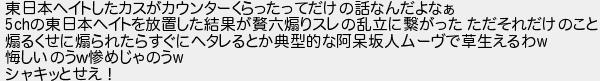 東日本ヘイトしたカスがカウンターくらったってだけの話なんだよなぁ の東日本ヘイトを放置した結果が六煽りスレの乱立に繋がった ただそれだけのこと 煽るくせに煽られたらすぐにヘタレるとか典型的な阿呆坂人ムーヴで草生えるわ 悔しいのう惨めじゃのう シャキッとせえ!