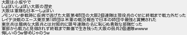 217: (東京都) [] 2026/01/06(火) 11:05:09.35 ID:wJkLfU2B 大阪は小坂やで しょぼいしょぼい大阪の歴史 大阪は軍隊も日本一しょぼい ノモンハン参戦時に仮病で逃げた大阪第4師団の大阪2個連隊は現役兵のくせに終戦まで戦力外だった レイテ決戦のエース東京第1師団は米軍の戦況報告で日本の師団中最強と賞賛された 東京兵は臆病な大阪兵とは対照的に頭号連隊の名に恥じぬ勇敢な部隊だった 軍部から戦力と見做されず終戦まで無傷で生き残った大阪の弱兵2個連隊wwww 悔しいのうw惨めじゃのうw http://egg.5ch.net/test/read.cgi/develop/1766723949/217