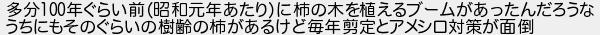 多分年ぐらい前昭和元年あたりに柿の木を植えるブームがあったんだろうな うちにもそのぐらいの樹齢の柿があるけど毎年定とアメシロ対策が面倒