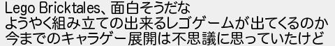 面白そうだな ようやく組み立ての出来るレゴゲームが出てくるのか 今までのキャラゲー展開は不思議に思っていたけど