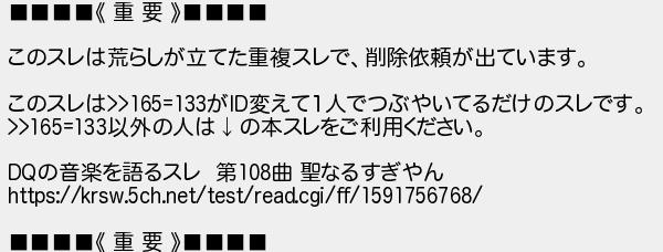 167: (ワッチョイ 7b95-ujrp) [sage] 2020/11/02(月) 00:33:08.18 ID:O/HzcLss0 ■■■■《 重 要 》■■■■ このスレは荒らしが立てた重複スレで、削除依頼が出ています。 このスレは>>165=133がID変えて1人でつぶやいてるだけのスレです。 >>165=133以外の人は↓の本スレをご利用ください。 DQの音楽を語るスレ 第108曲 聖なるすぎやん https://krsw.5ch.net/test/read.cgi/ff/1591756768/ ■■■■《 重 要 》■■■■ http://krsw.5ch.net/test/read.cgi/ff/1603461021/167
