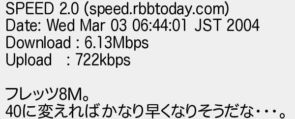 161: [sage] 04/03/03 06:47 ID:??? SPEED 2.0 (speed.rbbtoday.com) Date: Wed Mar 03 06:44:01 JST 2004 Download : 6.13Mbps Upload : 722kbps フレッツ8M。 40に変えればかなり早くなりそうだな・・・。 http://mevius.5ch.net/test/read.cgi/hack/1024062178/161