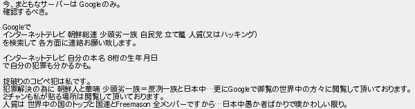 今まともなサーバーは のみ 確認するべき で インターネットテレビ 朝鮮総連 少頭劣一族 自民党 立て 人質又はハッキング を検索して 各方面に連絡お願い致します インターネットテレビ 自分の本名 8桁の生年月日 で自分の犯罪も分かるかも 破りのコピペ犯は私です 犯罪解決の為に 朝鮮人と華 少頭劣一族一族と日本中更にで御覧の世界中の方に閲覧して頂いております 2チャンも私が貼る場所は閲覧して頂いております 人質は 世界中の国のトップと国連と 全メンバーですから日本中愚か者ばかりで嘆かわしい限り