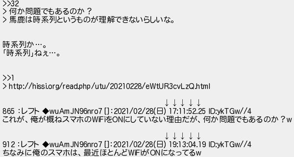 43: [sage] 2021/04/10(土) 09:43:38 ID:??? >>32 > 何か問題でもあるのか? > 馬鹿は時系列というものが理解できないらしいな。 時系列か…。 「時系列」ねぇ…。 >>1 > http://hissi.org/read.php/utu/20210228/eWtUR3cvLzQ.html ↓↓↓↓↓ 865 :レフト ◆wuAmJN96nro7 []:2021/02/28(日) 17:11:52.25 ID:ykTGw//4 これが、俺が概ねスマホのWiFiをONにしていない理由だが、何か問題でもあるのか?w ↓↓↓↓↓ 912 :レフト ◆wuAmJN96nro7 []:2021/02/28(日) 19:13:04.19 ID:ykTGw//4 ちなみに俺のスマホは、最近ほとんどWiFiがONになってるw http://mevius.5ch.net/test/read.cgi/hack/1614549113/43