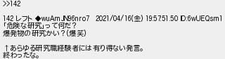 475: [sage] 2021/04/19(月) 12:18:44 ID:??? >>142 142 レフト ◆wuAmJN96nro7 2021/04/16(金) 19:57:51.50 ID:6wUEQsm1 「危険な研究」って何だ? 爆発物の研究かい?(爆笑) ↑あらゆる研究職経験者には有り得ない発言。 終わったな。 http://mevius.5ch.net/test/read.cgi/hack/1614549113/475