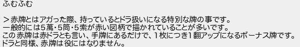ふむふむ 赤牌とはアガった際持っているとドラ扱いになる特別な牌の事です 一般的には55筒5索が赤い図柄で描かれていることが多いです この赤牌は赤ドラとも言い手牌にあるだけで1枚につき1翻アップになるボーナス牌です ドラと同様赤牌は役にはなりません