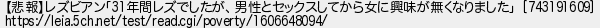 179: [sage] 2020/11/29(日) 20:45:39.58 【悲報】レズビアン「31年間レズでしたが、男性とセックスしてから女に興味が無くなりました」 [743191609] https://leia.5ch.net/test/read.cgi/poverty/1606648094/ http://medaka.5ch.net/test/read.cgi/honobono/1605856421/179