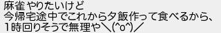 麻雀やりたいけど 今帰宅途中でこれから夕飯作って食べるから 1時回りそうで無理や