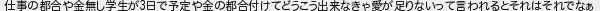 仕事の都合や金無し学生が日で予定や金の都合付けてどうこう出来なきゃ愛が足りないって言われるとそれはそれでなぁ