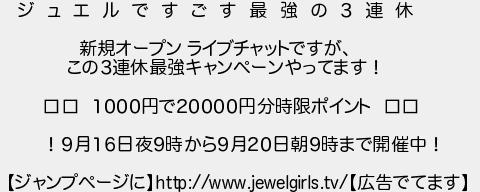 ジ ュ エ ル で す ご す 最 強 の 3 連 休 新規オープン ライブチャットですが この3連休最強キャンペーンやってます! 1000円で20000円分時限ポイント !9月16日夜9時から9月20日朝9時まで開催中! ジャンプページに広告でてます
