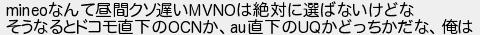 653: (テテンテンテン MMe6-rQR6 [133.106.140.66]) [] 2022/05/13(金) 16:31:17 ID:jhm0K4TtM mineoなんて昼間クソ遅いMVNOは絶対に選ばないけどな そうなるとドコモ直下のOCNか、au直下のUQかどっちかだな、俺は http://mao.5ch.net/test/read.cgi/isp/1650646500/653