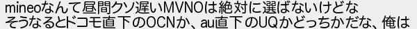 653: (テテンテンテン MMe6-rQR6 [133.106.140.66]) [] 2022/05/13(金) 16:31:17 ID:jhm0K4TtM mineoなんて昼間クソ遅いMVNOは絶対に選ばないけどな そうなるとドコモ直下のOCNか、au直下のUQかどっちかだな、俺は http://mao.5ch.net/test/read.cgi/isp/1650646500/653