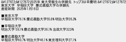 年 東大受験生の併願先 トップは早慶明 東京大学 早稲田大学 慶応義塾大学の併願先 産経新聞 年月日 東京大学 早稲田大学 慶応義塾大学 明治大学 早稲田大学 明治大学 慶応義塾大学 法政大学 慶応義塾大学 早稲田大学 明治大学 東京理科大学