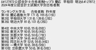 167: [] 2025/04/29(火) 16:09:18.10 ID:him4jdCn 🎀公認会計士合格者数トップ3 慶応 早稲田 明治🎀 2024年度公認会計士試験大学別合格者数 ランキング大学名 合格者数 昨年度 第1位 慶応義塾大学 171名 165名(1位) 第2位 早稲田大学 131名 128名(2位) 第3位 明治大学 81名 101名(3位) 第4位 中央大学 63名 55名(6位) 第5位 東京大学 60名 56名(4位) 第6位 京都大学 55名 50名(7位) 第7位 神戸大学 54名 44名(8位) 第8位 同志社大学 52名 56名(4位) 第9位 一橋大学 50名 38名(9位) 第10位 立命館大学 50名 38名(9位) http://medaka.5ch.net/test/read.cgi/jsaloon/1741663307/167