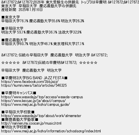 437: [] 2025/09/01(月) 17:00:39.87 ID:7kP8Po8L 🎀🎀2026年 東大受験生の併願先 トップ3は早慶明 🎀🎀 東京大学 早稲田大学 慶応義塾大学の併願先 産経新聞 2025年1月16日 ■東京大学 早稲田大学76.1% 慶応義塾大学55.6% 明治大学26.3% ■早稲田大学 明治大学 59.1% 慶応義塾大学36.1% 法政大学32.9% ■慶応義塾大学 早稲田大学60.7% 明治大学46.1% 東京理科大学27.1% 🎀 伝統の早稲田大学 慶応義塾大学 明治大学 🎀 ☆☆☆☆☆ 🎀伝統の早慶明🎀 ☆☆☆☆☆ 早稲田大学 慶応義塾大学 明治大学 ■早慶明3大学BIG BAND JAZZ FESTA■ https://www.facebook.com/3bb.jazz/ https://kumin.news/taito/articles/546325 ■早慶明キャンパス■ https://www.waseda.jp/top/access/waseda-campus https://www.keio.ac.jp/ja/about/campus/ https://www.meiji.ac.jp/koho/campus_guide/ ■早稲田大学校歌■ https://www.waseda.jp/top/about/work/almamater ■慶應義塾大学塾歌■ http://nannen.my.coocan.jp/music.html ■明治大学校歌■ https://www.meiji.ac.jp/koho/information/schoolsong/index.html http://medaka.5ch.net/test/read.cgi/jsaloon/1741663307/437