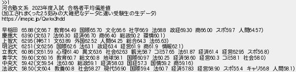 482: [] 2025/09/14(日) 23:43:53.47 ID:1BoiD/3L >>1 河合塾文系 2023年度入試 合格者平均偏差値 (加工されまくった2.5刻みの大雑把なデータと違い受験生の生データ) https://imepic.jp/Qwkx3hdd 早稲田 65.88(文66.7 教育64.49 国際65.70 文化66.6 社学66.9 法68.8 政経69.30 商66.00 スポ59.7 人間64.57) 慶應大 63.90(文63.7 法66.30 経済66.70 商66.40 総政60.2 環情60.1) 上智大 62.95(神57.1 文63.89 外国62.52 人間64.25 総合64.3 法65.63) 明治大 62.51(文62.56 国際62.6 法63.1 政経63.4 経営61.9 商61.9 情報62.1) 立教大 60.86(文61.59 心理61.40 異文63.6 社会62.63 観光58.7 コミ57.65 法61.87 経済61.4 経営62.95 スポ56.8) 青学大 59.60(文60.16 教育60.7 総文60.8 地球58.1 国際60.97 法60.25 経済58.60 経営60.3 コミ58.1 社会58.0) 中央大 59.42(文59.54 法63.60 総政59.1 経済58.03 国経57.3 国情59.2 商59.16) 法政大 58.50(文60.4 教養60.8 社会58.27 現代56.90 国際59.4 法60.7 経済57.83 経営58.90 スポ55.4 キャリ56.8 人間58.1) http://medaka.5ch.net/test/read.cgi/jsaloon/1754312338/482