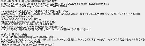 京都大学 ウイルス再生医科学研究所准教授の発言 宮沢孝幸子供がコロナに感染する事は全くリスクが無く逆に良いことです!感染することを薦めます! こんな教授らがいる京都大学だから子供の命などとも思ってない 今フェスができること音楽ができること 音楽ライブのコロナ対策をバージョンアップ! 万人死んだところでインパクトは無い 生物学的には死のうが人類は滅亡する事は無い 割死のうが割死のうが人類は滅亡する事は無い コロナで死ななくともガンや他の病気で死ぬ皆覚悟がない コロナで死のうが他の病気で死のうが同じ命であコロナで死ぬんやと思ったらいい 京都大学 藤井聡 大先生 イベントで医療崩壊と戦う知事をムカつくと叱りつつ コロナ飲んでもかまわないこいつら知事たちにムカつかない国民にムカつくなどとほざいたあげくなんかええ気分で歌なんか歌うてる
