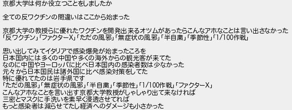 京都大学は何か役立つことをしましたか 全ての反ワクチンの間違いはここから始まった 京都大学の教授らに優れたワクチンを開発出来るオツムがあったらこんなアホなことは言い出さなかった 反ワクチンファクターただの風邪無症状の風邪半自粛季節性作戦 思い出してみてイタリアで感染爆発が始まったころを 日本国内には多くの中国や多くの海外からの観光客が来てた なのに中国やヨーロッパに比べ日本国内の感染者数は少なかった 元から日本国民は諸外国に比べ感染対策をしてた 特に優れてたのは岩手県です ただの風邪無症状の風邪半自粛季節性作戦ファクター こんなアホなことを言い出す京都大学教授がしゃしゃり出て来なければ 三密とマスクに手洗いを素早く浸透させてれば もっと感染者は減らせてたし経済へのダメージも小さかった