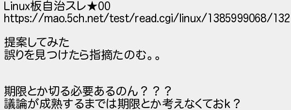 653: [sage] 2021/02/02(火) 01:57:18 ID:e7TNTIZH Linux板自治スレ★00 https://mao.5ch.net/test/read.cgi/linux/1385999068/132 提案してみた 誤りを見つけたら指摘たのむ。。 期限とか切る必要あるのん??? 議論が成熟するまでは期限とか考えなくておk? http://mao.5ch.net/test/read.cgi/linux/1325679982/653