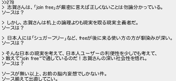 281: [sage] 2017/09/14(木) 00:11:43.47 ID:puhA0iYx >>278 > 志賀さんは、「join free」が厳密に言えば正しくないことは勿論分かっている。 ソースは? > しかし、志賀さんは机上の論理よりも現実を取る現実主義者だ。 ソースは? > 日本人には「シュガーフリー」など、freeが後に来る使い方の方が馴染みが深い。 ソースは? > そんな日本の現実を考えて、日本人ユーザーの利便性を少しでも考えて、 > 敢えて"join free"で通しているのだ!志賀さんの深い社会性を悟れ。 ソースは? ソースが無い以上、お前の脳内妄想でしかない件。 ソース揃えて出直してこい。 http://mao.5ch.net/test/read.cgi/linux/1498067713/281