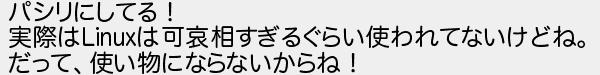 470: [] 2020/06/05(金) 20:30:20.07 ID:Tb6G8hGB パシリにしてる! 実際はLinuxは可哀相すぎるぐらい使われてないけどね。 だって、使い物にならないからね! http://mao.5ch.net/test/read.cgi/linux/1586490121/470