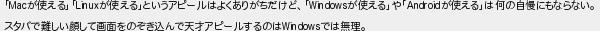 693: [] 2020/07/12(日) 18:21:39 ID:6yNeFx7K 「Macが使える」「Linuxが使える」というアピールはよくありがちだけど、「Windowsが使える」や「Androidが使える」は何の自慢にもならない。 スタバで難しい顔して画面をのぞき込んで天才アピールするのはWindowsでは無理。 http://mao.5ch.net/test/read.cgi/linux/1586490121/693