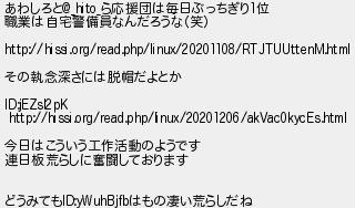 720: [sage] 2020/12/20(日) 07:50:35 ID:RU+Kebk1 あわしろと@_hito_ら応援団は毎日ぶっちぎり1位 職業は自宅警備員なんだろうな(笑) http://hissi.org/read.php/linux/20201108/RTJTUUttenM.html その執念深さには脱帽だよとか ID:jEZsI2pK http://hissi.org/read.php/linux/20201206/akVac0kycEs.html 今日はこういう工作活動のようです 連日板荒らしに奮闘しております どうみてもID:yWuhBjfbはもの凄い荒らしだね http://mao.5ch.net/test/read.cgi/linux/1590745607/720