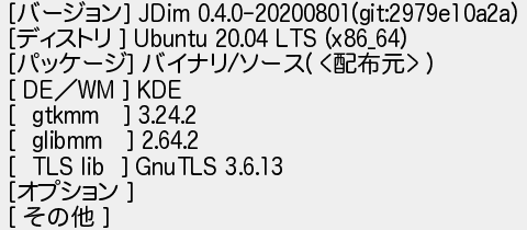 653: [sage] 2020/08/03(月) 10:47:30 ID:o99kX3pC [バージョン] JDim 0.4.0-20200801(git:2979e10a2a) [ディストリ ] Ubuntu 20.04 LTS (x86_64) [パッケージ] バイナリ/ソース( <配布元> ) [ DE/WM ] KDE [ gtkmm ] 3.24.2 [ glibmm ] 2.64.2 [ TLS lib ] GnuTLS 3.6.13 [オプション ] [ その他 ] http://mao.5ch.net/test/read.cgi/linux/1593923889/653