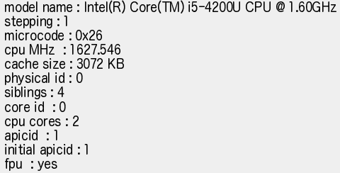 469: [] 2022/05/21(土) 19:39:25.55 ID:VWpd8qhm model name : Intel(R) Core(TM) i5-4200U CPU @ 1.60GHz stepping : 1 microcode : 0x26 cpu MHz : 1627.546 cache size : 3072 KB physical id : 0 siblings : 4 core id : 0 cpu cores : 2 apicid : 1 initial apicid : 1 fpu : yes http://mao.5ch.net/test/read.cgi/linux/1620213913/469