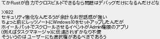 926: 915 [sage] 2023/01/14(土) 14:44:05.46 ID:AdtlAO3D てかRustが自力でクロスビルドできるなら問題はデバッグだけになるんだけどな >>922 セキュリティ強化なんだろうが余計なお世話感が強い ちょっと前にレッツノートにWindows10をセットアップしたんだが ホイールパットでスクロールさせるイベントがAdmin権限のアプリ (例えばタスクマネージャ)に伝達されずかなり不便 そういうのはユーザーにも選択権があるべきであろう http://mao.5ch.net/test/read.cgi/linux/1620213913/926