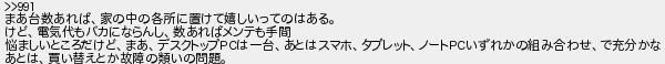 まあ台数あれば家の中の各所に置けて嬉しいってのはある けど電気代もバカにならんし数あればメンテも手間 悩ましいところだけどまあデスクトップは一台あとはスマホタブレットノートいずれかの組み合わせで充分かな あとは買い替えとか故障の類いの問題