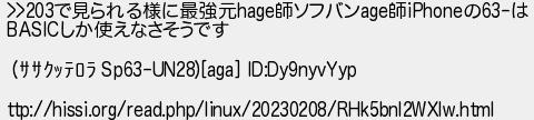 653: (アウアウアー Sa8f-2QBG) [] 2023/02/08(水) 10:35:46.73 ID:rC6+A4Tda >>203で見られる様に最強元hage師ソフバンage師iPhoneの63-は BASICしか使えなさそうです (ササクッテロラ Sp63-UN28)[aga] ID:Dy9nyvYyp ttp://hissi.org/read.php/linux/20230208/RHk5bnl2WXlw.html http://mao.5ch.net/test/read.cgi/linux/1666781156/653