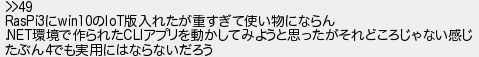 53: (オイコラミネオ MMad-EnxK) [sage] 2023/03/03(金) 20:13:40.43 ID:IHeObxSpM >>49 RasPi3にwin10のIoT版入れたが重すぎて使い物にならん .NET環境で作られたCLIアプリを動かしてみようと思ったがそれどころじゃない感じ たぶん4でも実用にはならないだろう http://mao.5ch.io/test/read.cgi/linux/1677312913/53