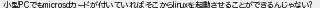800: (ワッチョイ 4eaf-+ts8) [sage] 2023/09/15(金) 09:10:27.19 ID:DTEjoP5P0 小型PCでもmicrosdカードが付いていればそこからlinuxを起動させることができるんじゃない? http://mao.5ch.io/test/read.cgi/linux/1677312913/800