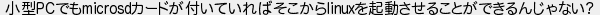 800: (ワッチョイ 4eaf-+ts8) [sage] 2023/09/15(金) 09:10:27.19 ID:DTEjoP5P0 小型PCでもmicrosdカードが付いていればそこからlinuxを起動させることができるんじゃない? http://mao.5ch.io/test/read.cgi/linux/1677312913/800