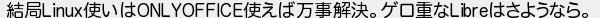465: [sage] 2025/06/12(木) 10:05:18.23 ID:hQtDKFUT 結局Linux使いはONLYOFFICE使えば万事解決。ゲロ重なLibreはさようなら。 http://mao.5ch.net/test/read.cgi/linux/1715327399/465