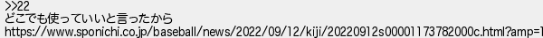 89: (ワッチョイ a967-PQth [14.10.49.225]) [] 2022/09/14(水) 20:21:11.40 ID:8xE24YKy0 >>22 どこでも使っていいと言ったから https://www.sponichi.co.jp/baseball/news/2022/09/12/kiji/20220912s00001173782000c.html?amp=1 http://tanuki.5ch.net/test/read.cgi/livebase/1663152693/89
