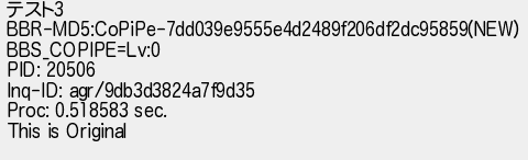 90: †Mango Mangüé ⭐ (ワッチョイ f324-ryZq) [sage] 2026/03/13(金) 00:28:00.888877 ID:DjG3A9is0 テスト3 BBR-MD5:CoPiPe-7dd039e9555e4d2489f206df2dc95859(NEW) BBS_COPIPE=Lv:0 PID: 20506 Inq-ID: agr/9db3d3824a7f9d35 Proc: 0.518583 sec. This is Original http://agree.5ch.io/test/read.cgi/mango/1751808994/90