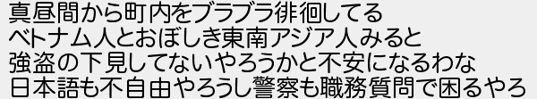 真昼間から町内をブラブラしてる ベトナム人とおぼしき東南アジア人みると 強盗の下見してないやろうかと不安になるわな 日本語も不自由やろうし警察も職務質問で困るやろ