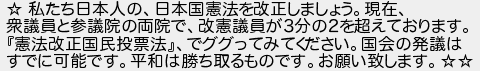 235: [sage] 2018/01/22(月) 12:03:39.64 ID:DQK4oU+m ☆ 私たち日本人の、日本国憲法を改正しましょう。現在、 衆議員と参議院の両院で、改憲議員が3分の2を超えております。 『憲法改正国民投票法』、でググってみてください。国会の発議は すでに可能です。平和は勝ち取るものです。お願い致します。☆☆ http://lavender.5ch.net/test/read.cgi/nika/1180098007/235